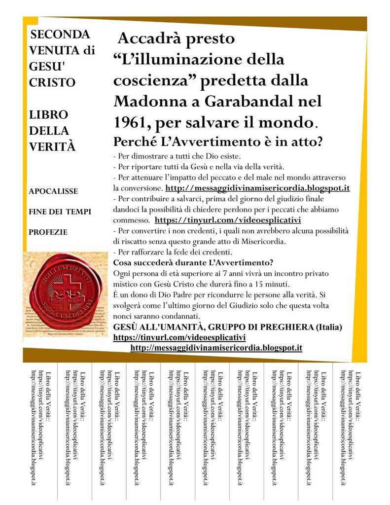 | Posted: 25 Mar 2021 08:36 AM PDT ◇◆● ● ◇ Volantino sull'Avvertimento - da diffondere, Per favore diffondete questo volantino il più possibile, attaccatelo nella via pubblica, o chiedete permesso nei negozi e così via. Gesù vuole salvare tutti! https://gesau-it.tumblr.com/post/174433182363/nuovo-volantino-sullavvertimento-da |