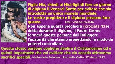 ( Libro della Verità, 27 Marzo 2012 – Vergine Maria: Chiedete i miei figli di fare un giorno di digiuno il Venerdì Santo per prevenire una moneta mondiale