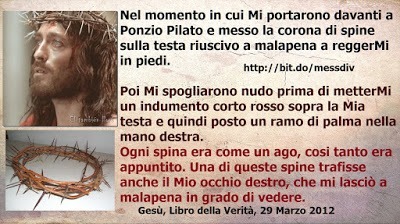 Ogni spina era come un ago, cosi tanto era appuntito. Una di queste spine trafisse anche il Mio occhio destro, che mi lasciò a malapena in grado di vedere. (Gesù, Libro della Verità, 29 Marzo 2012 – Gesù rivela i dettagli della Sua crocifissione)
