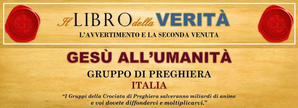 - Gruppi della crociata di preghieraCari fratelli queste parole sono rivolte proprio a noi, forza ci impegniamo a costituire i gruppi Gesù all'umanità, accogliamo questo appello urgente del nostro Signore Gesù, raddoppiamo gli sforzi che ognuno si metta in contatto con le persone della sua Diocesi: “MOLTO PRESTO UNA DIVISIONE SI VERIFICHERÀ IN EUROPA, OGNUNA DELLE QUALI È COLLEGATA ALL'UNIONE EUROPEA E AL PAESE IN CUI SI TROVA LA CATTEDRA DI PIETRO. CIÒ SI TRADURRÀ IN UNA GUERRA, CHE SARÀ DI TIPO DIVERSO DALLE ALTRE GUERRE. MA SARÀ VIOLENTA. LA GENTE SI LEVERÀ L'UNO CONTRO L'ALTRO IN GERMANIA, ITALIA E FRANCIA. DOVETE PREGARE CHE I MIEI SEGUACI RIMANGANO FORTI E GARANTISCANO CHE I GRUPPI DI PREGHIERA DI GESÙ PER L'UMANITÀ SIANO COSTITUITI RAPIDAMENTE IN QUESTI PAESI ( Gesù, Libro della Verità, 26 febbraio 2013)”, qua e qua .