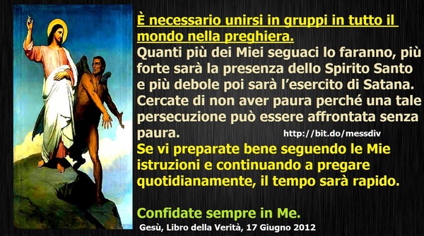 ** Per salvaguardare questa Missione contro la malvagità di Satana, vi chiedo di iniziare a recitare questa potente preghiera per rinunciare a satana. Quando recitate questa Crociata d Preghiera, almeno due volte a settimana, contribuite a proteggere questa Missione di Salvezza e portare più anime nel Dominio del Regno di Dio. (31 gennaio 2014)