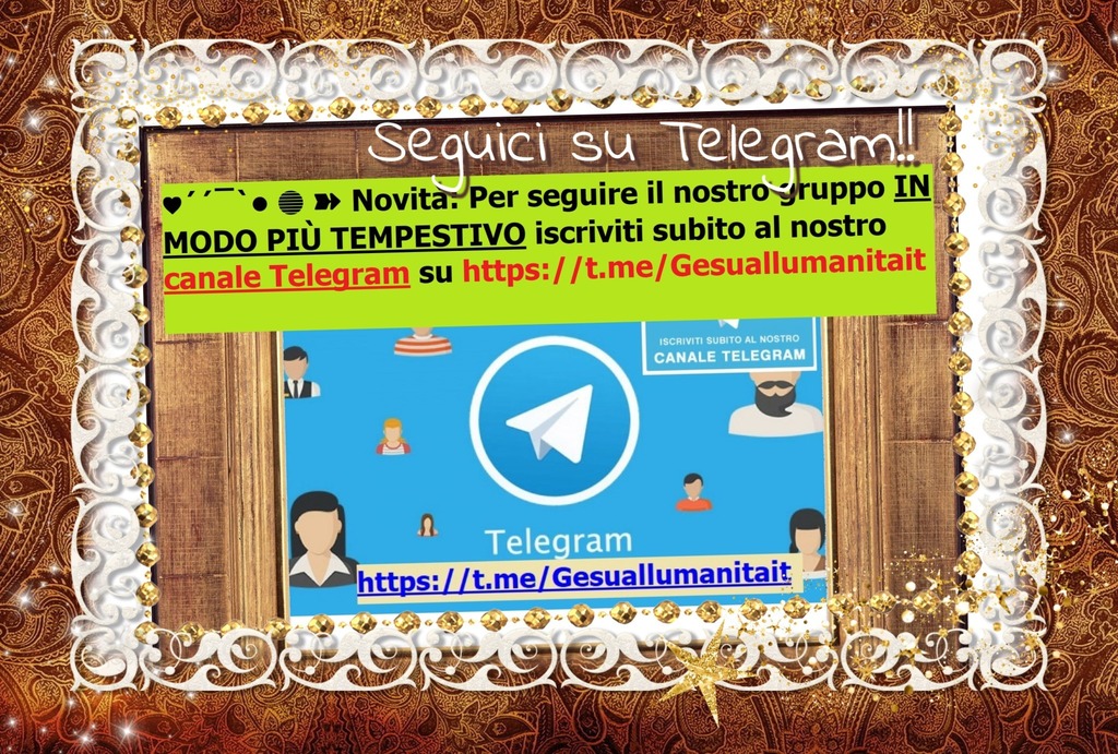 GESÙ ALL'UMANITÀ,GRUPPO DI PREGHIERA (Italia):Vedere tutti i post pubbliccati su https://twitter.com/GesAU_it o https://crociatadipreghiera.wordpress.com/ ♥´´¯`•.¸¸.☆Questo è un semplice gruppo della crociata di preghiera, che desidera aiutare Gesù con le nostre umili preghiere a salvare le anime. ´¯`•☆♥´´¯`• Questo è il gruppo delle anime più piccole dell'Esercito rimanente di Gesù in Italia, e siamo sotto la protezione della nostra Santa Patrona, Santa Teresa di Lisieux ´¯`•☆